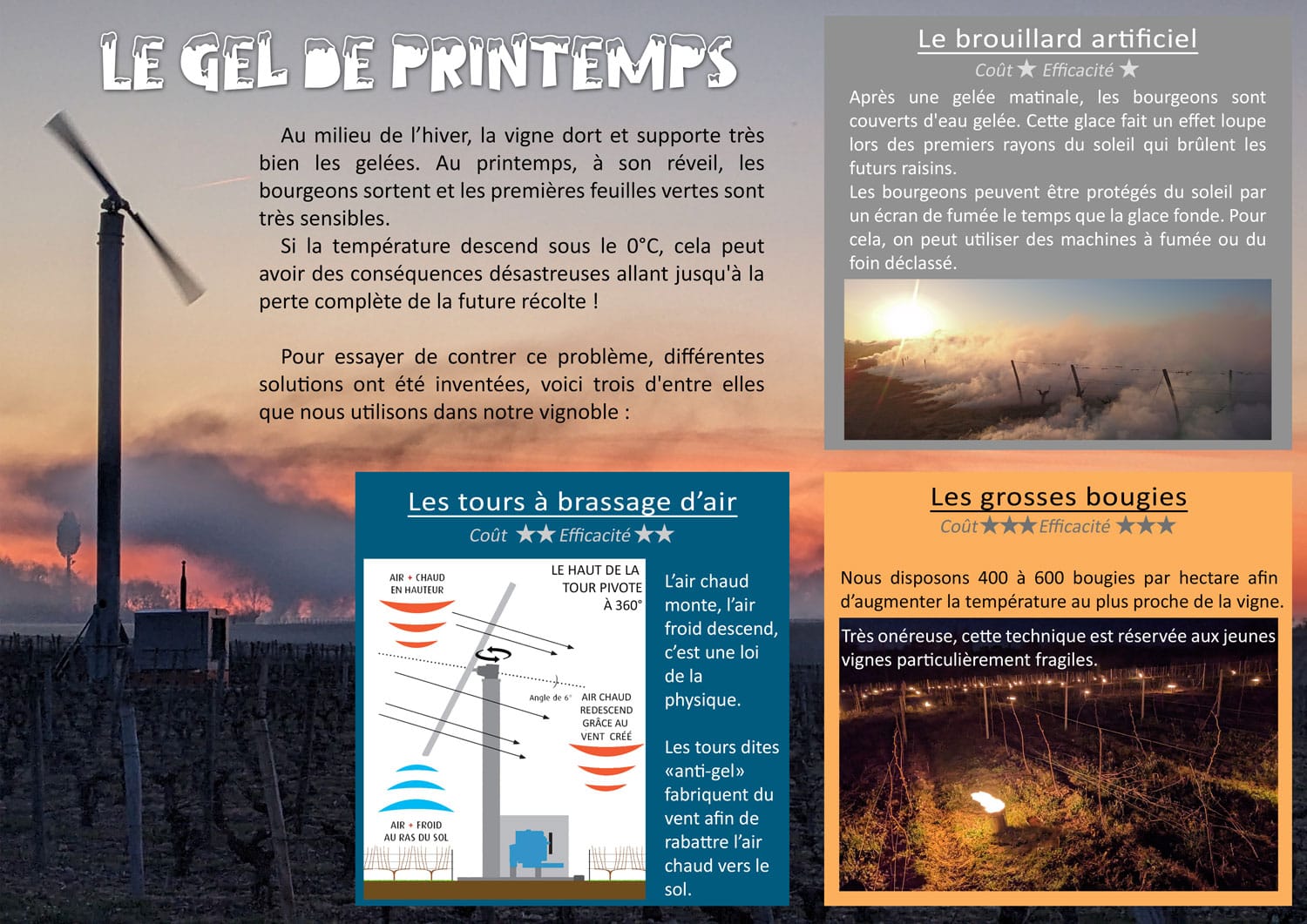 La solution : Disposées au plus proche du pied de vigne, ces bougies augmentent directement la température ambiante de la parcelle. Très onéreuse et physique à mettre en place, cette technique est réservée chez nous à nos jeunes vignes, particulièrement vulnérables face aux aléas climatiques.